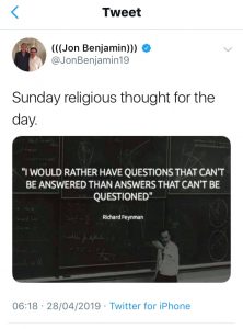 ‘I would rather have questions that can’t be answered than answers that can’t be questioned,’ Jon Benjamin posted a quote by Richard Feynman. Since it’s his Sunday ritual to post something for the religious guys, I’d have to assume the Christian faith is being called to task here.