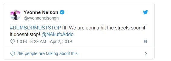 In a Twitter post, Yvonne Nelson wrote; “#DUMSORMUSTSTOP !!!! We are gonna hit the streets soon if it doesn’t stop!”.