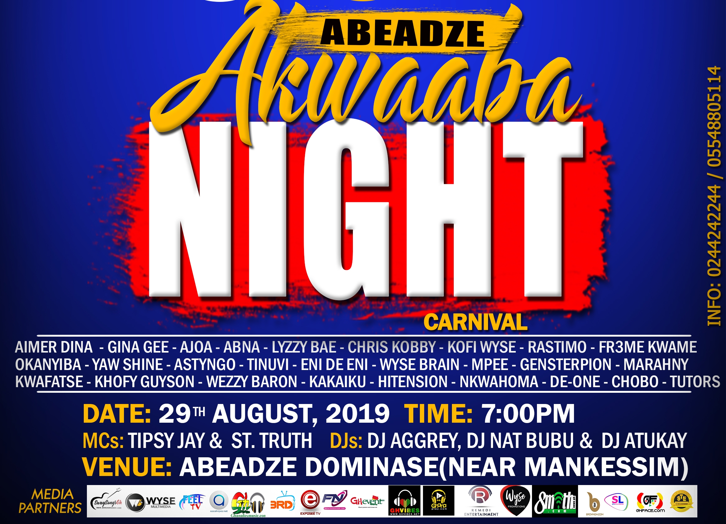 Wyse Promotions and Back Yard Entertainment bring to us the maiden edition of Abeadze Akwaaba Night Carnival 2019 at Abeadze Dominase near Mankessim on August 29, 2019.