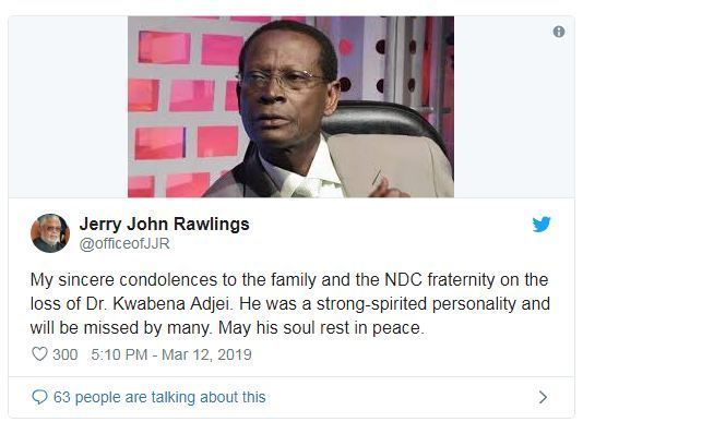 Founder of the National Democratic Congress (NDC) Jerry John Rawlings has sent “sincere condolences” to the family of Dr Kwabena Adjei, who died on Tuesday after a short illness.