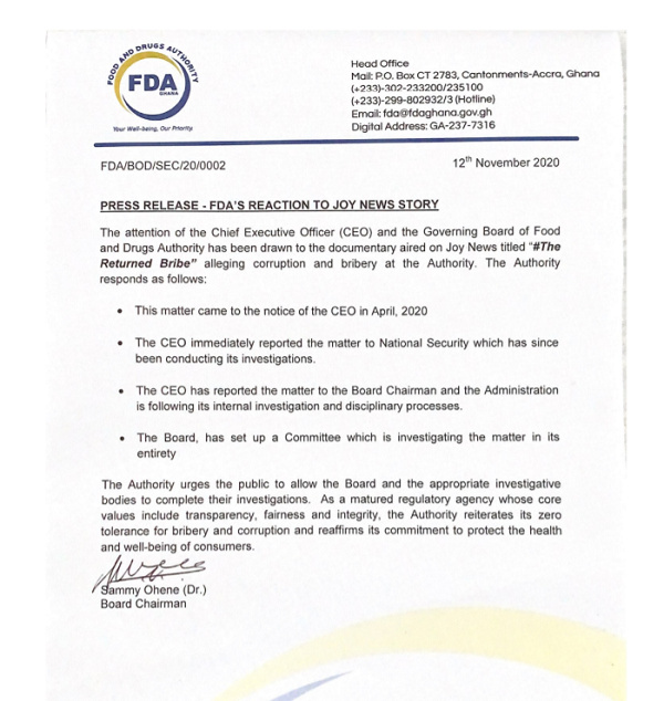 A statement signed and issued by the Board Chair of the FDA, Dr. Sammy Ohene, said the matter had been under investigation since April 2020.