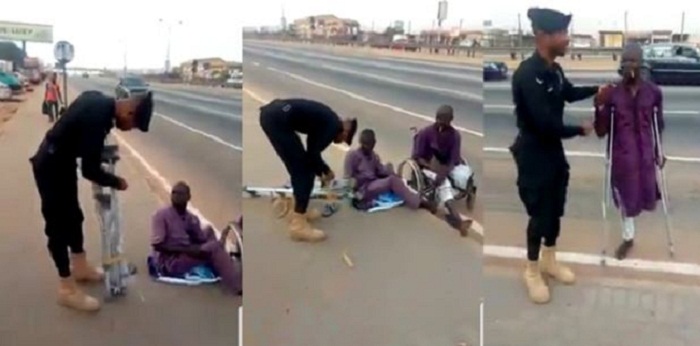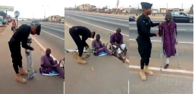 In a video making rounds, the generous police officer is seen handing over the crutches to a disabled street beggar.