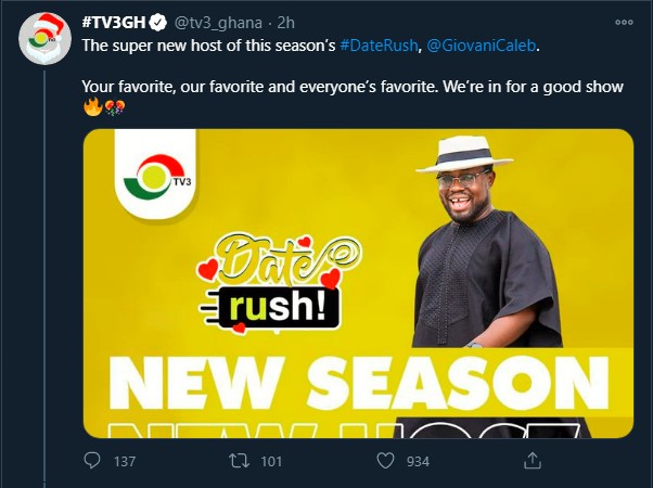 Broadcaster Giovanni Caleb has replaced Henry Nii Kpakpo Thompson as the new host of the much-watched Date Rush reality show.