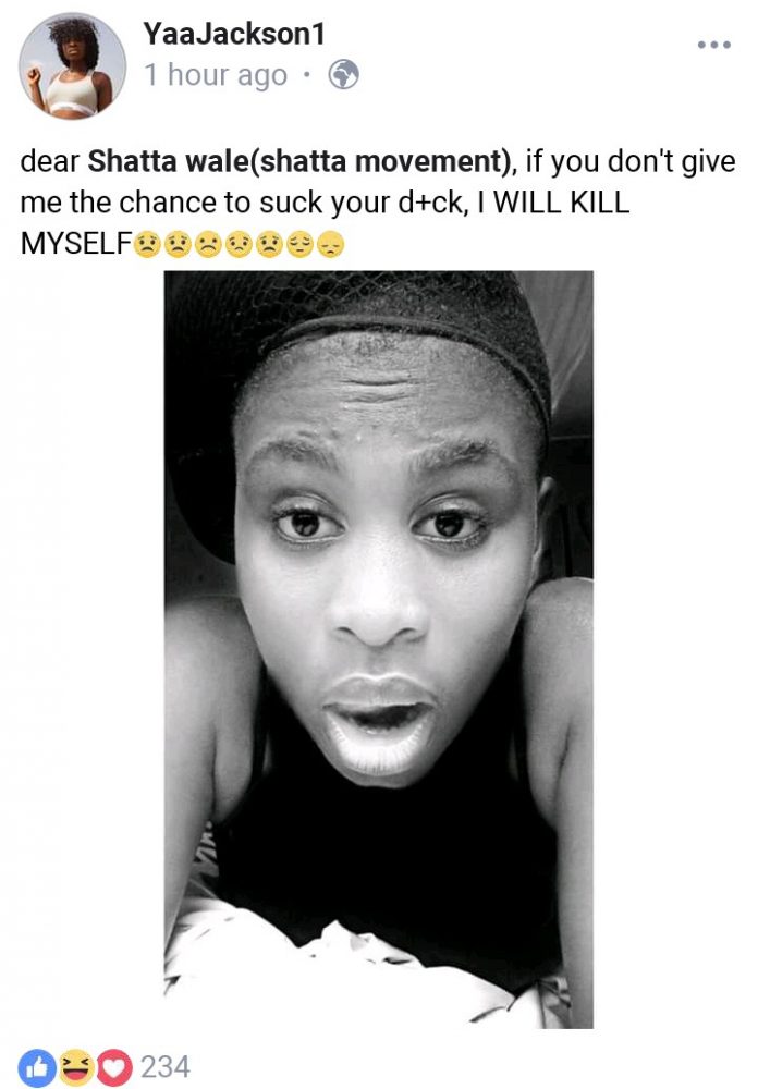 “Dear shatta wale (shatta movement) if you don’t give me the chance to s.uck your d+ck, I will kill myself.”