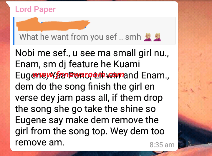 Revelations from the screenshots from a post by Lord Paper in his Whatsapp Group put the bare that Kuami Eugene is a snitch and a bad man.