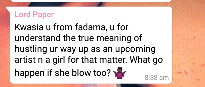 Lord Paper, upon hearing this impatiently jumped into his Whatsapp group to expose and shame Kuami Eugene with a couple of threats.