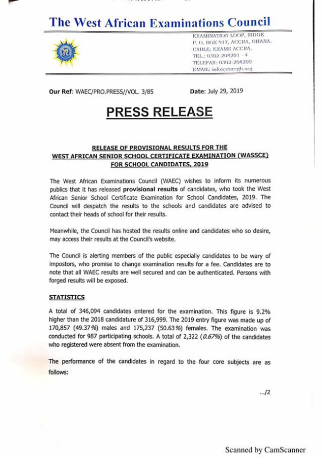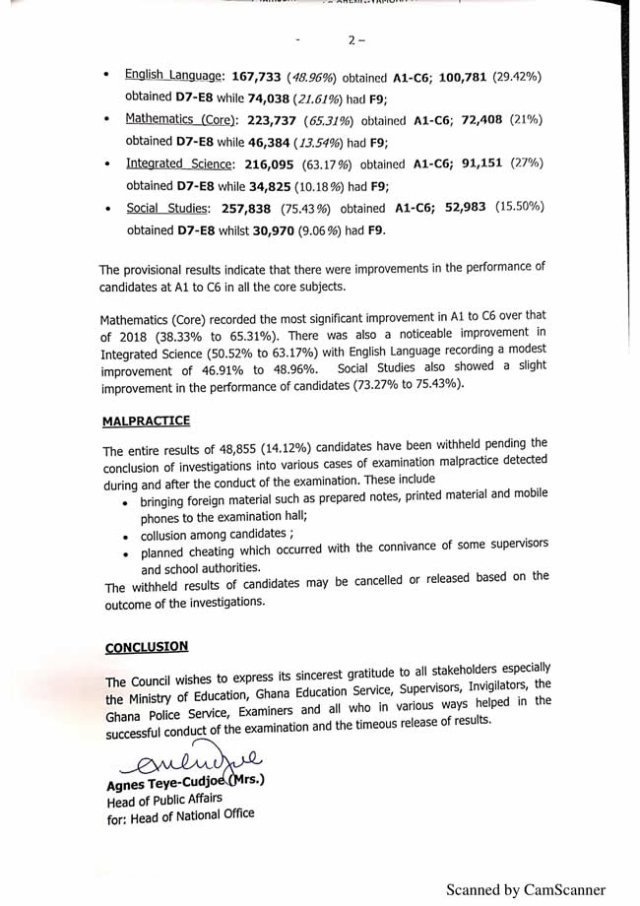 In a statement signed by the Head of Public Affairs of WAEC, Agnes Teye-Cudjoe said “The entire results of 48,855 (14.12%) candidates have been withheld pending the conclusion of investigations into various cases of examination malpractice detected during and after the conduct of the examination.”
