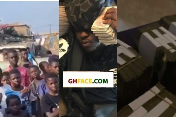 In a recent video, the latest father in town is seen spraying money on a group of street kids who are seen fighting hard just to land their hands on any of the Cedi bills.