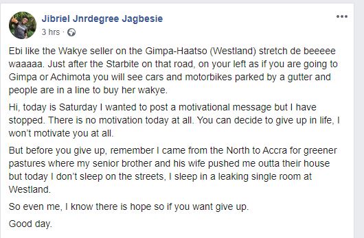 But before you give up, remember I came from the North to Accra for greener pastures where my senior brother and his wife pushed me outta their house but today I don’t sleep on the streets, I sleep in a leaking single room at Westland.