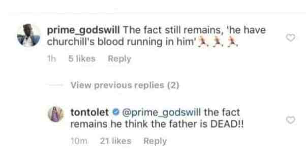 The Nollywood actress made this known while responding to fan’s comment on her post saying; ‘The fact remains, he has Churchill’s blood running in him.