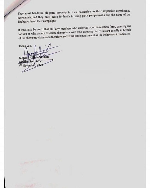 The party has directed these persons to hand over all party property in their possession to the constituency secretariats.