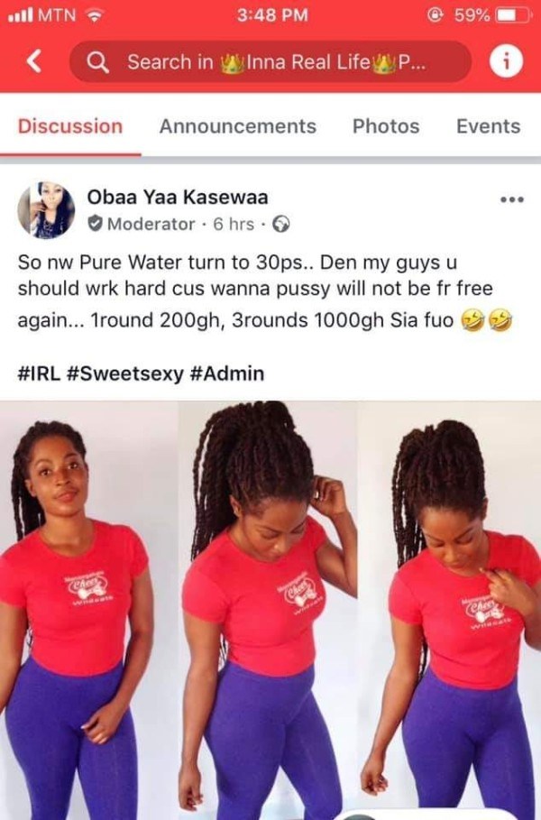 “So nw Pure water turn to 30ps.. Den my guys u should wrk hard cus wanna p*** will not be free again… 1round 200gh, 3rounds 1000gh Sia fuo”.