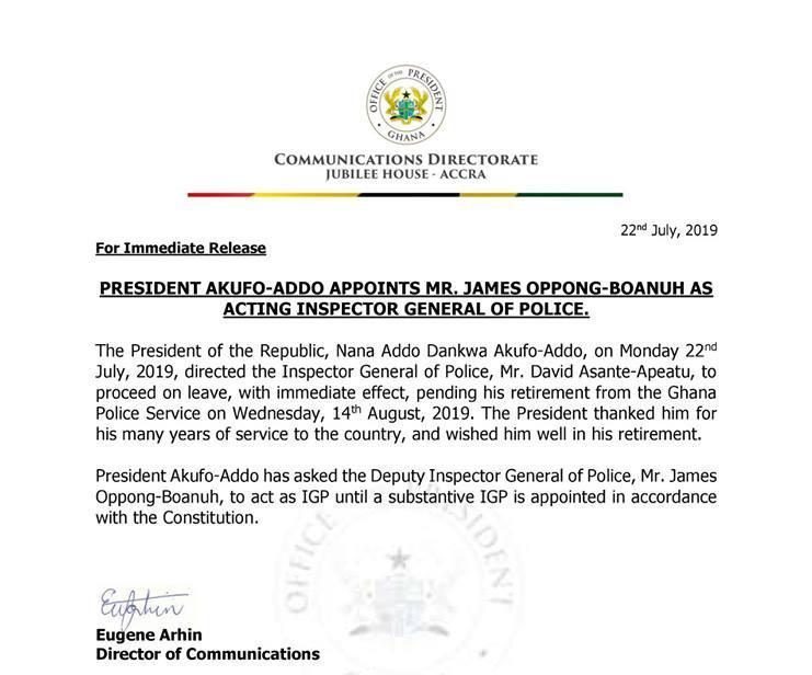 He has thus appointed the Deputy IGP, James Oppong-Boanuh as Acting IGP.