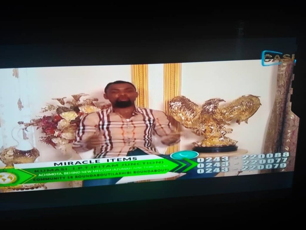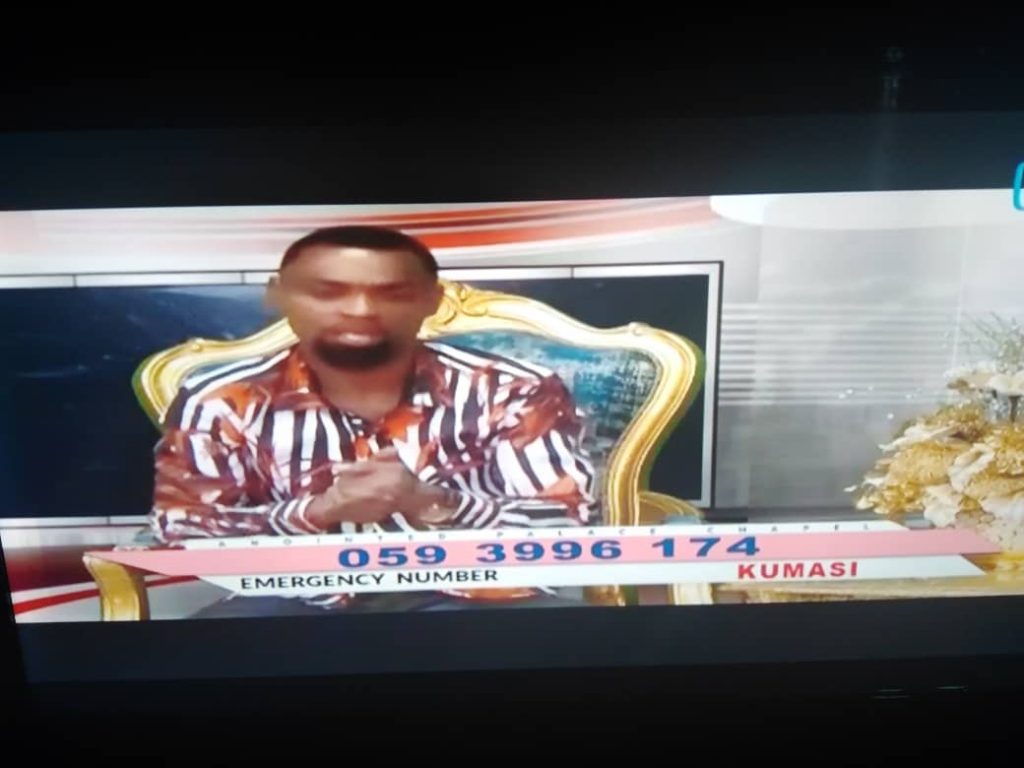 Rev Obofour, although yet to open his Church, Anointed Palace Chapel is seen on live his own Cash TV, monitored by FNN24.com advertising some of his miracle items and giving out his emergency number.