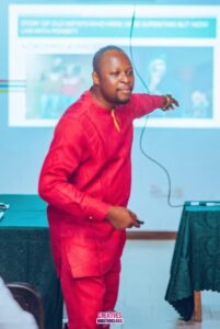 Bismark Botctwey, aka Sintim, delivered a presentation on digital branding, highlighting the importance of establishing a strong online presence in today’s digital age. He shared practical tips and strategies on how creatives can leverage digital platforms to build their brand and reach a wider audience.