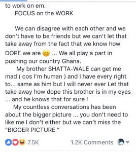 ‘There’s is a bigger picture out there for us (musicians) to look at,’ Sarkodie began his lengthy Facebook post with these words.