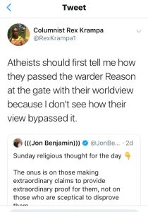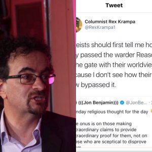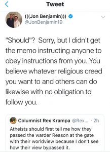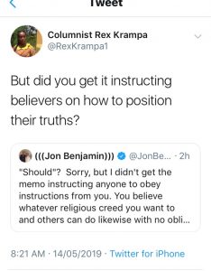 On Sunday 12th May 2019, Jon Benjamin decided to post yet another religious thought to which I responded to. (Find here). This morning, I tweeted a statement in the article at him to which he responded. Jon and I at it again!