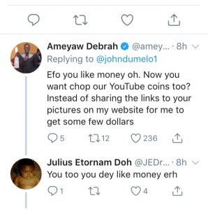 Ameyaw Debrah replied the post with these words: “Efo you like money oh. Now you wan chop our YouTube coins too? Instead of sharing the links to your pictures on my website for me to get a few dollars.”One fan, defending Mr. Dumelo, said, you too you dey like money erh.”