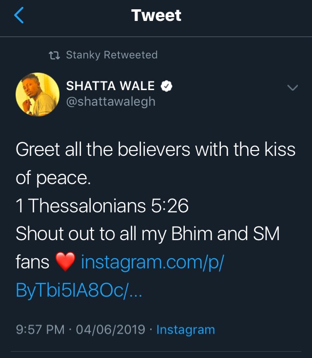 Shatta Wale took to social media to defend his ‘kiss’ by using a verse from the Bible. Quoting from 1 Thessalonians 5:26, he wrote, greet all believers with the kiss of peace.’