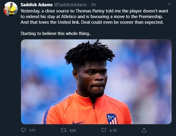 The Journalist in a Tweet disclosed that a source close to the footballer informed him of Partey’s intention of moving to Manchester United.